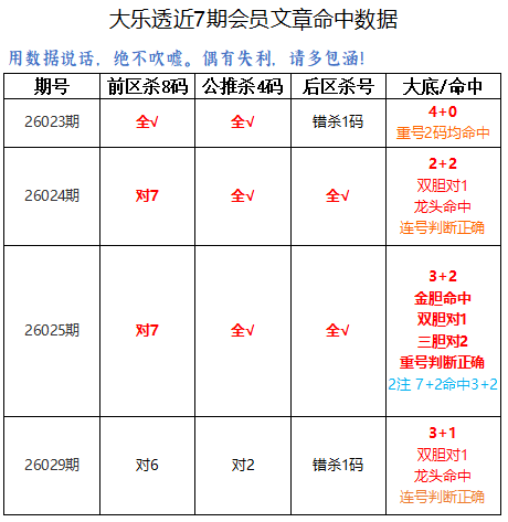 上期前区杀8码对6,公推杀4码对2。会员文章中龙头命中,双胆对1,连号判断正确,大底命中3+1,本期再接再厉。