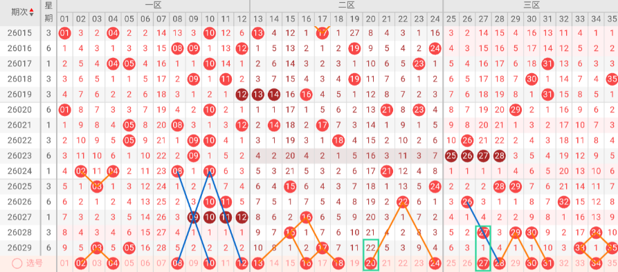 三区(25-35)分析:上期该区开出号码33 35,近10期占比32%,与上期相比+2%。本期无三斜连号趋势,隔码斜连走势28。该区间在爆发4码后,上期回调至2码,属于典型的过热后理性降温。目前热号均有短暂遗漏,而冷号也处于可反弹状态。本期将继续以1-2码的温和输出为主,但需防范继续降温至1码的可能,且断区风险仍未解除。推荐关注号码:27、28、30、31、34。