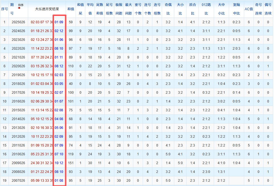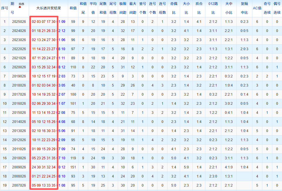 通过观察,我发现往年同期的开奖数据与本期号码之间存在显著关联。具体来说,在前区号码中,从第一位至第五位,通常会有约三个位置上的数字与往年同期相同位置的号码一致;而后区号码中,也有多期开奖结果直接包含了往年同期的数字。因此,我们可以借助往年同期各位置上的号码,作为分析本期开奖情况的重要依据。在此基础上,还可结合往年同期的其他相关条件,进行综合性的号码组合推荐。