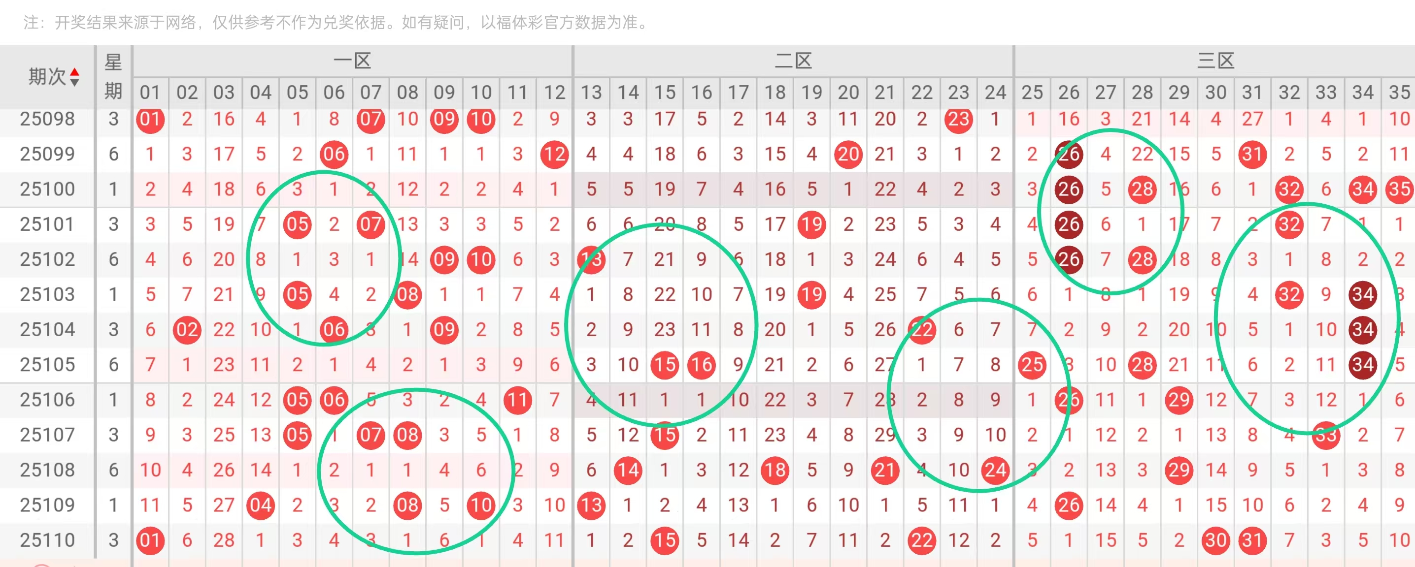 号码21在前区中属于“过热后回调”的典型代表。在2024年至2025年初期,21曾一度频繁出现,尤其在2024年下半年的多期开奖中密集开出(如2024年10月、12月等),呈现“热号”特征。然而,过热号码往往伴随阶段性冷却。统计显示,21在最近50期开奖中仅出现3次,且遗漏值逐步攀升至10期以上。这种从热转冷的趋势符合号码分布的“回调规律”,即高频号码在短期爆发后需经历调整期。同时,21在历史数据中多与20、22等号码形成区域集中(如20-25区间),但近期开奖的号码分布更偏向小号区(01-10)或大号区(30-35),中间区间活跃度下降。基于此,排除21可以规避号码周期性回调的风险,聚焦当前更可能活跃的区间。