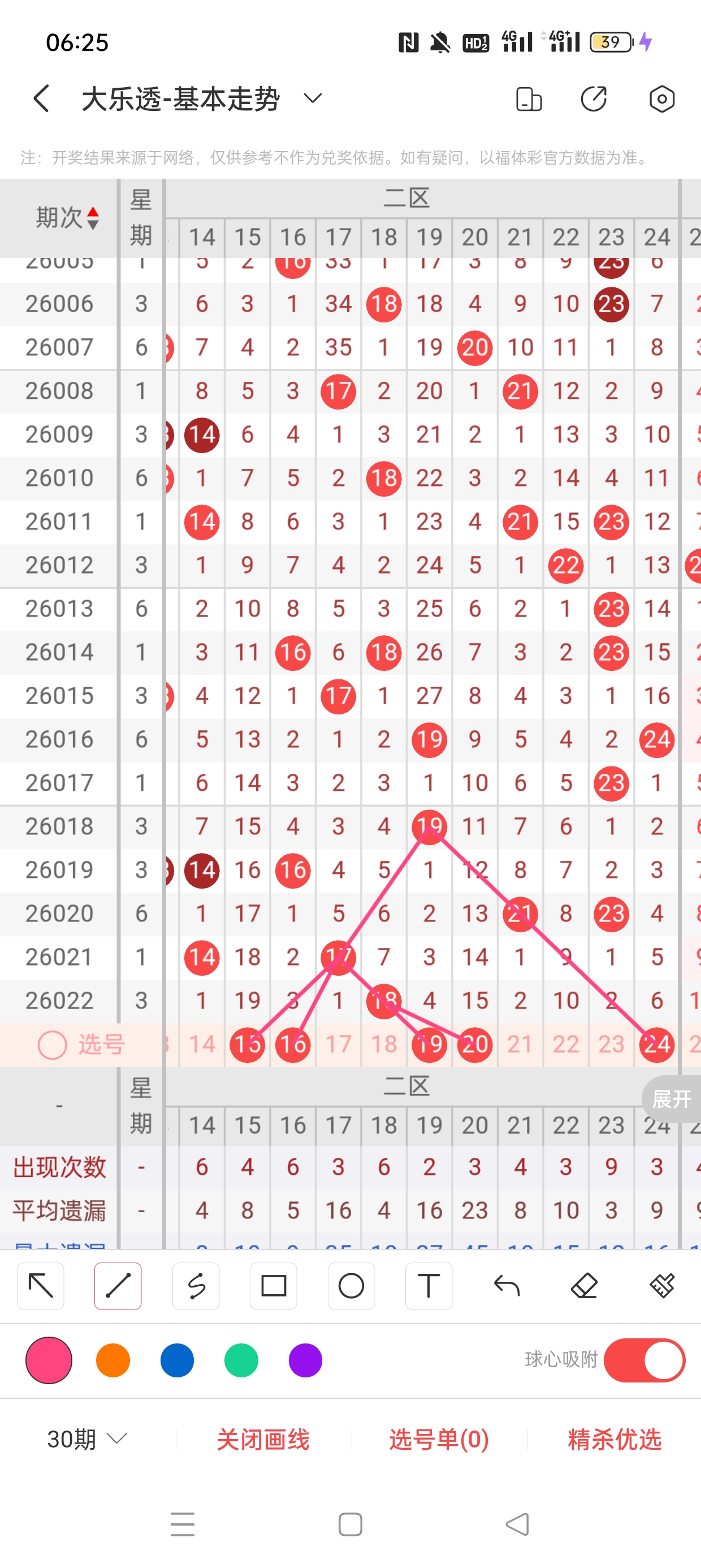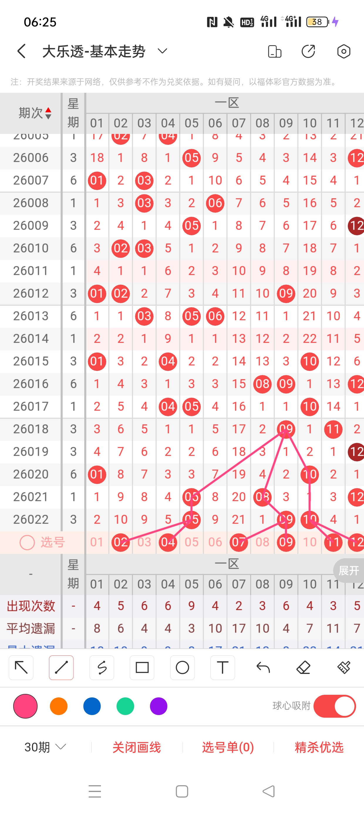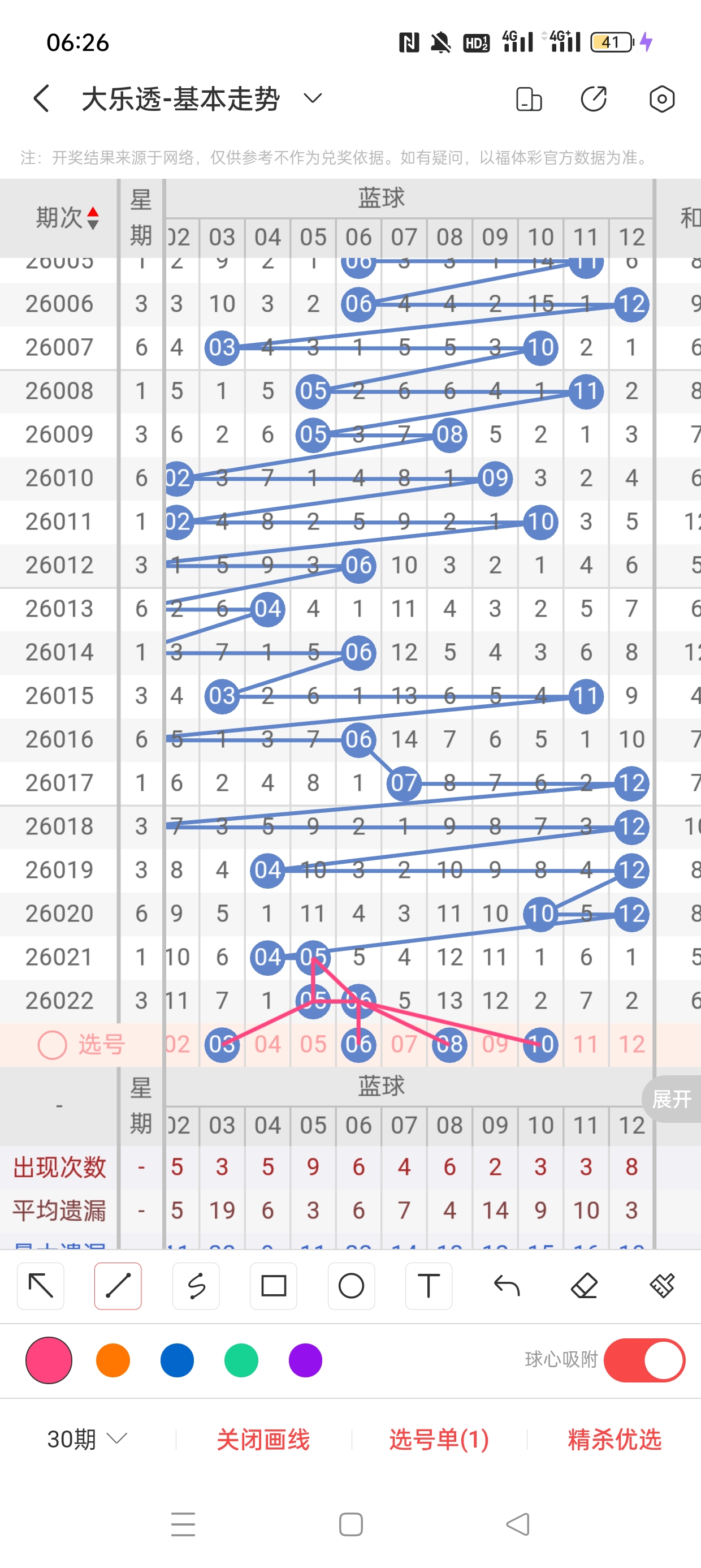 26022期开奖结果:5、9、10、18、26+5、6,奇偶比:2:3,大小比1:4,和值68,012路212,邻孤传0邻4孤1传,同尾号无,传号5,连号9、10。总结完毕,下面开始本期分析。