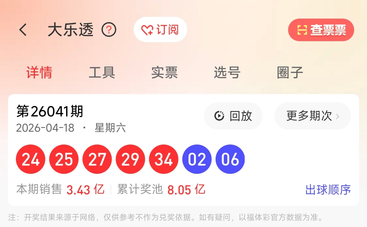 首先让我们回顾一下上期大乐透26041期的开奖为24、25、27、29、34,蓝球02、06 。前区和值139,前区跨10,区间比为0:1:4,奇偶比为3:2。