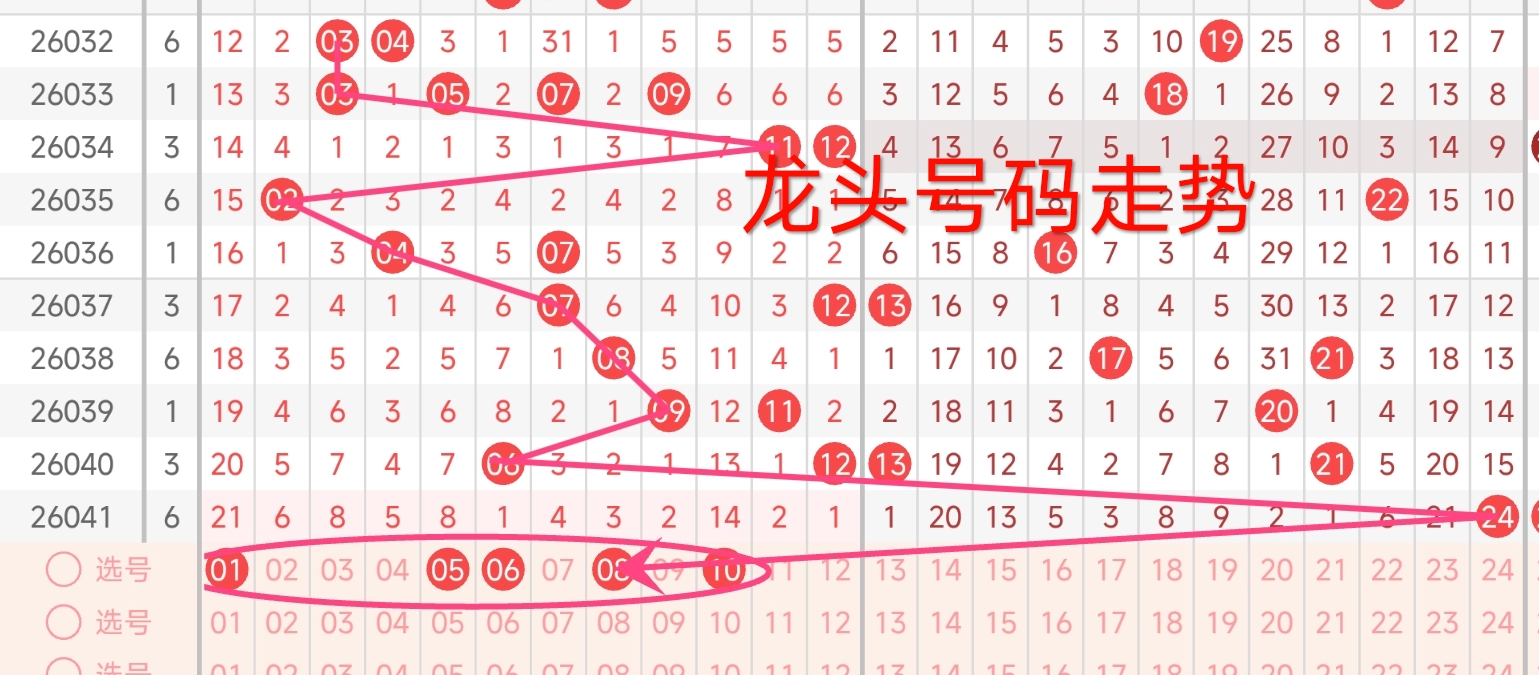 上期龙头号码为24,振幅上升了18点,开出偶数号码。从近期龙头号码的走势来看,近期龙头号码波动幅度较大。上期龙头开出24,是开出极端超级大龙头号码,这种极端走势不具备延续性。近期龙头整体在02-11区间波动,仅本期直接冲高到24,明显偏离正常运行轨道,因此本期龙头号码大概率会回落至小数号码区域,回补需求极为强烈。预计本期龙头号码可以重点关注01-11区间开出。本期还需注意连续多期漏出的号码,需重点关注,有回补龙头号码的趋势。 综合考虑,本期龙头号码推荐关注:01、05、06、08、10。