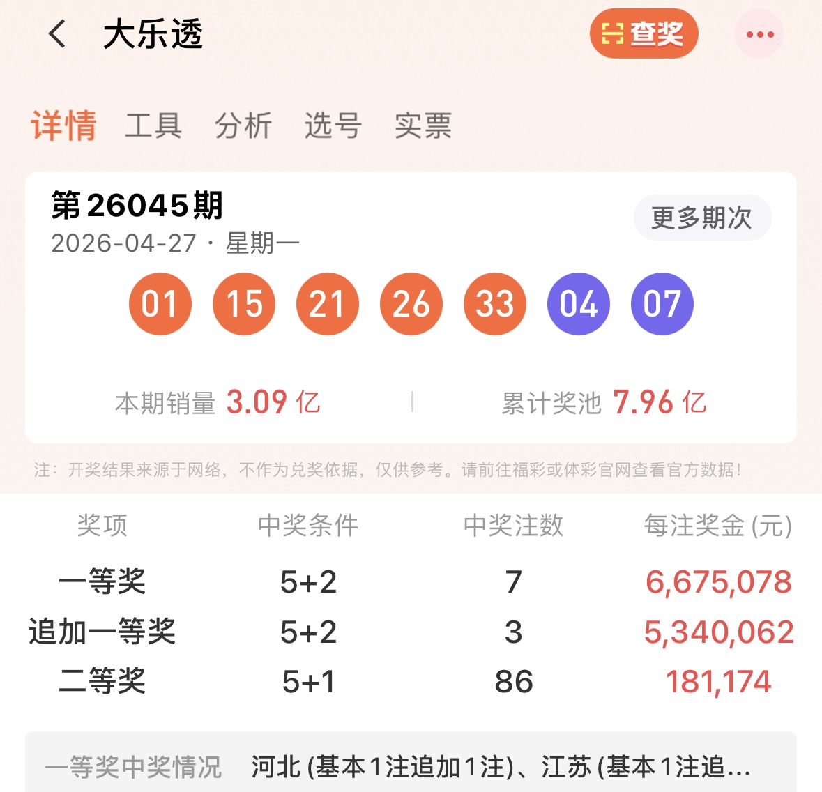 大乐透上期开出中奖号码01、15、21、26、33+04、07,全国共开出一等奖七注,单注奖金6,675,078元钱,其中有三注为追加投注,每注多得奖金5,340,062元钱。一等奖分别花落河北基本1注追加1注、江苏基本1注追加1注、广东基本1注、四川基本2注、云南基本1注、陕西基本1注追加1注。二等奖共开出86注,每注奖金181,174元钱,其中有12注为追加投注,每注多得奖金144,939元钱。