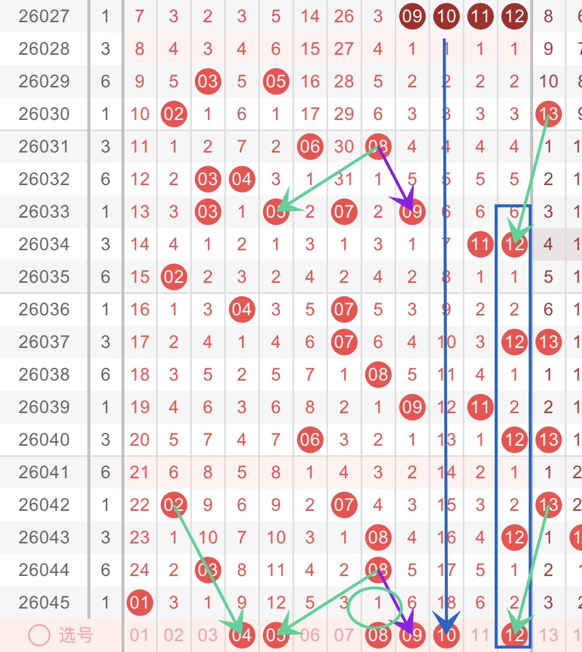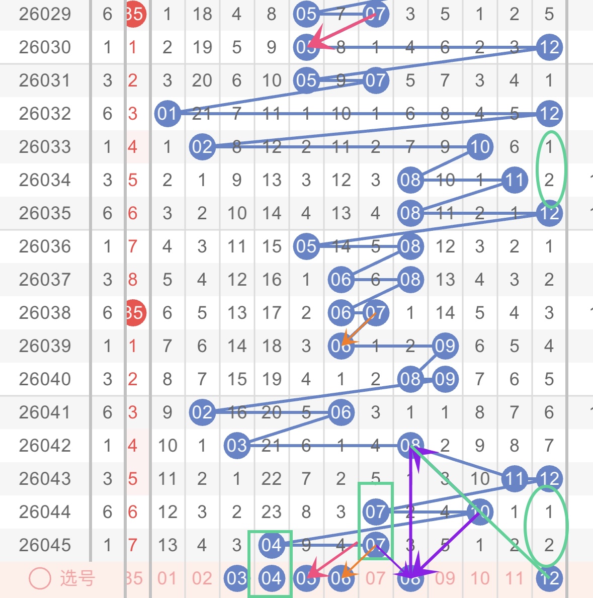 后区蓝色球上期开出了小大组合0407 ,两个都是一路号码,并且07还是一个重复号码。本期07会不会继续重复呢?个人觉得应该不会,而且本期应该是奇偶组合和偶偶组合为主。