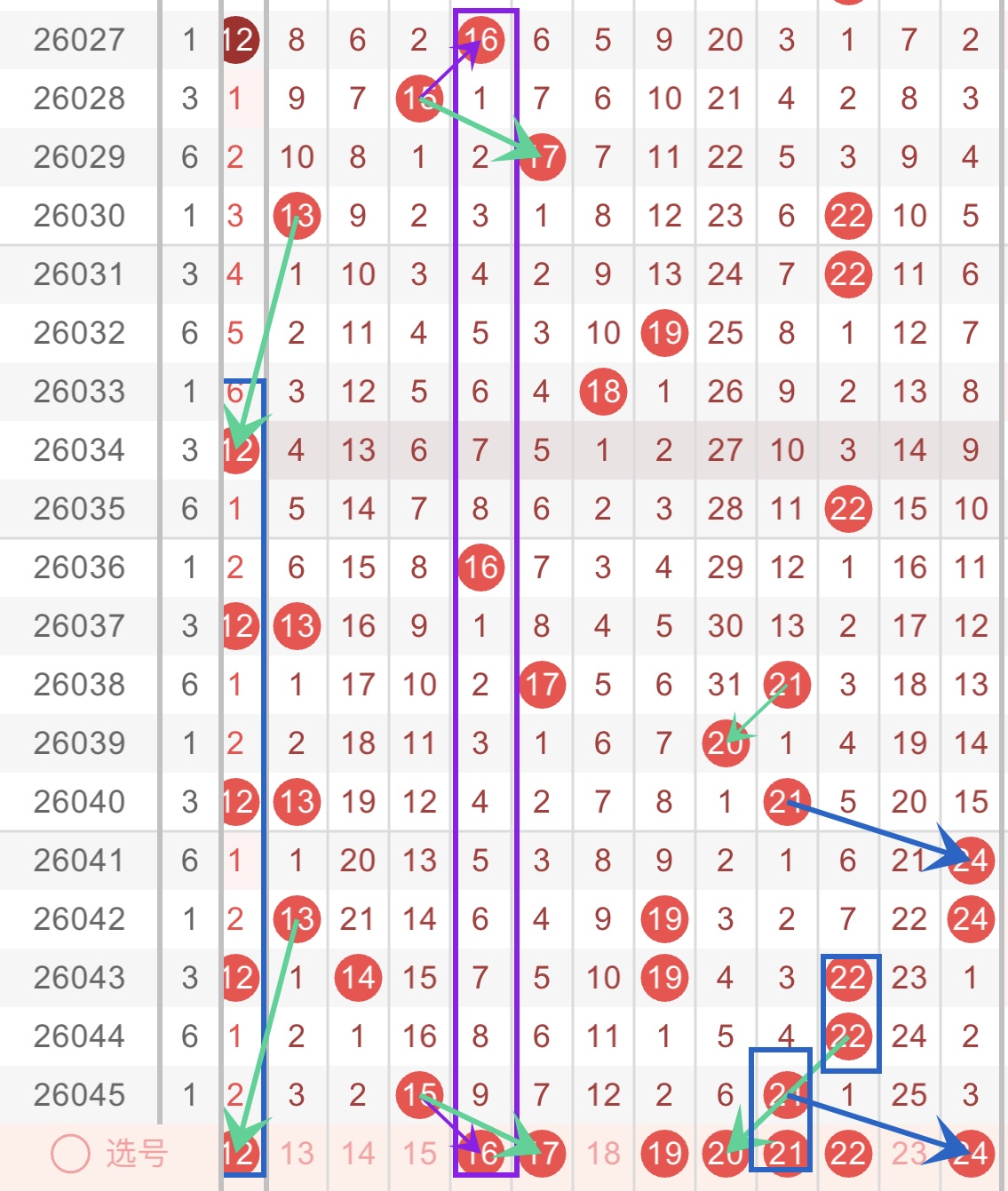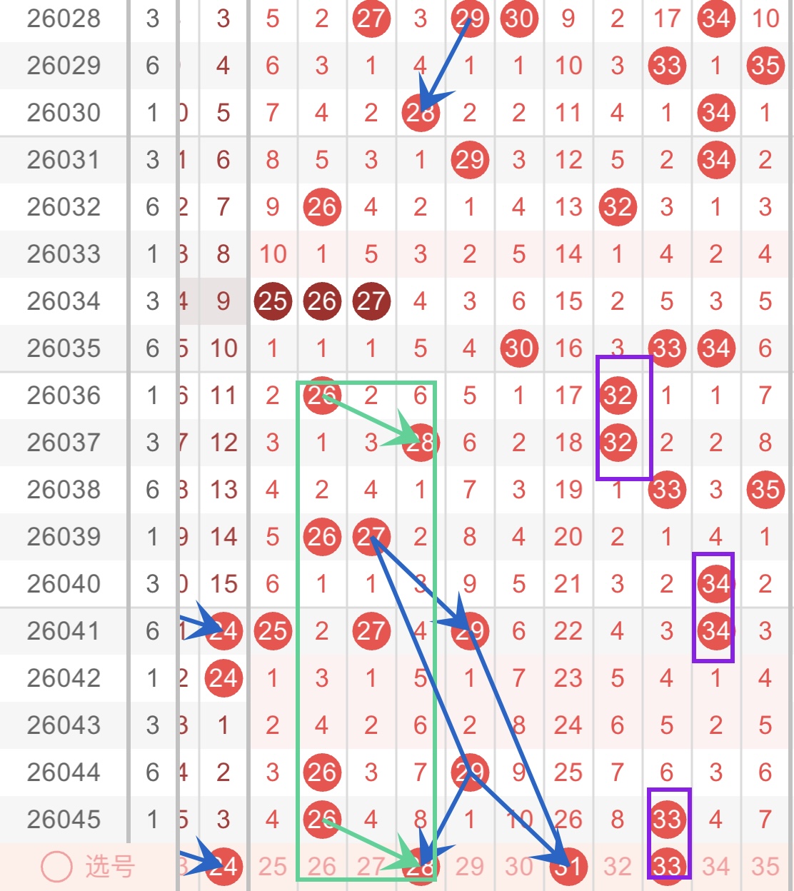 凤尾号码应该就从这两个号码中开出来,首先考虑33 ,其次考虑31。(由于本期红球三区有可能会出现断区,如果真的断开三区,那么凤尾号码就可以用红球二区的24)。