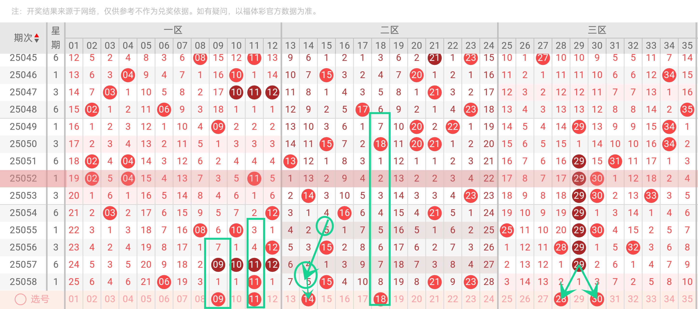 - 大号区冷门:33(遗漏20期)、34(遗漏19期)、35(遗漏18期)。