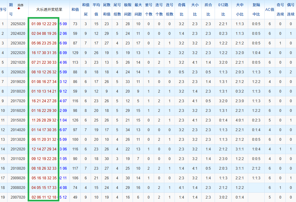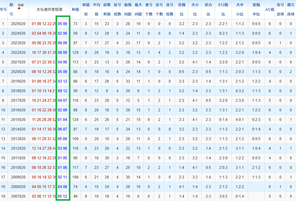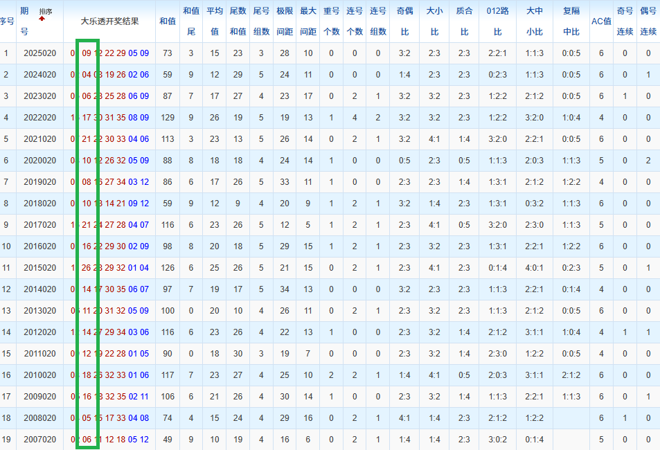 通过观察,我发现往年同期的开奖数据与本期号码之间存在显著关联。具体来说,在前区号码中,从第一位至第五位,通常会有约三个位置上的数字与往年同期相同位置的号码一致;而后区号码中,也有多期开奖结果直接包含了往年同期的数字。因此,我们可以借助往年同期各位置上的号码,作为分析本期开奖情况的重要依据。在此基础上,还可结合往年同期的其他相关条件,进行综合性的号码组合推荐。