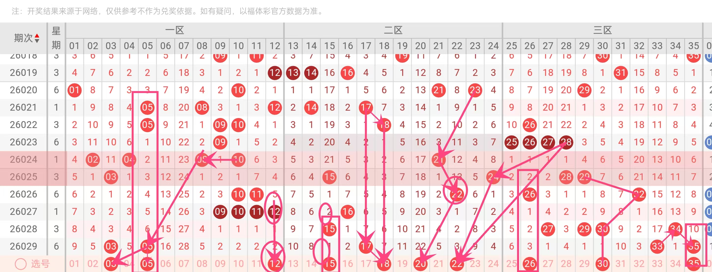 再次,区间分布上,一区(01-12)保留03、05、12,兼顾小号热度和冷号回补;二区(13-24)选择15、18、20、22,覆盖中段多个点位,防止连号或密集出号;三区(25-35)选择26、30、35,既保留大号热度,又避免过度集中。整体前区奇偶比为5:5,大小比(以17为界)为5:5,分布均衡。