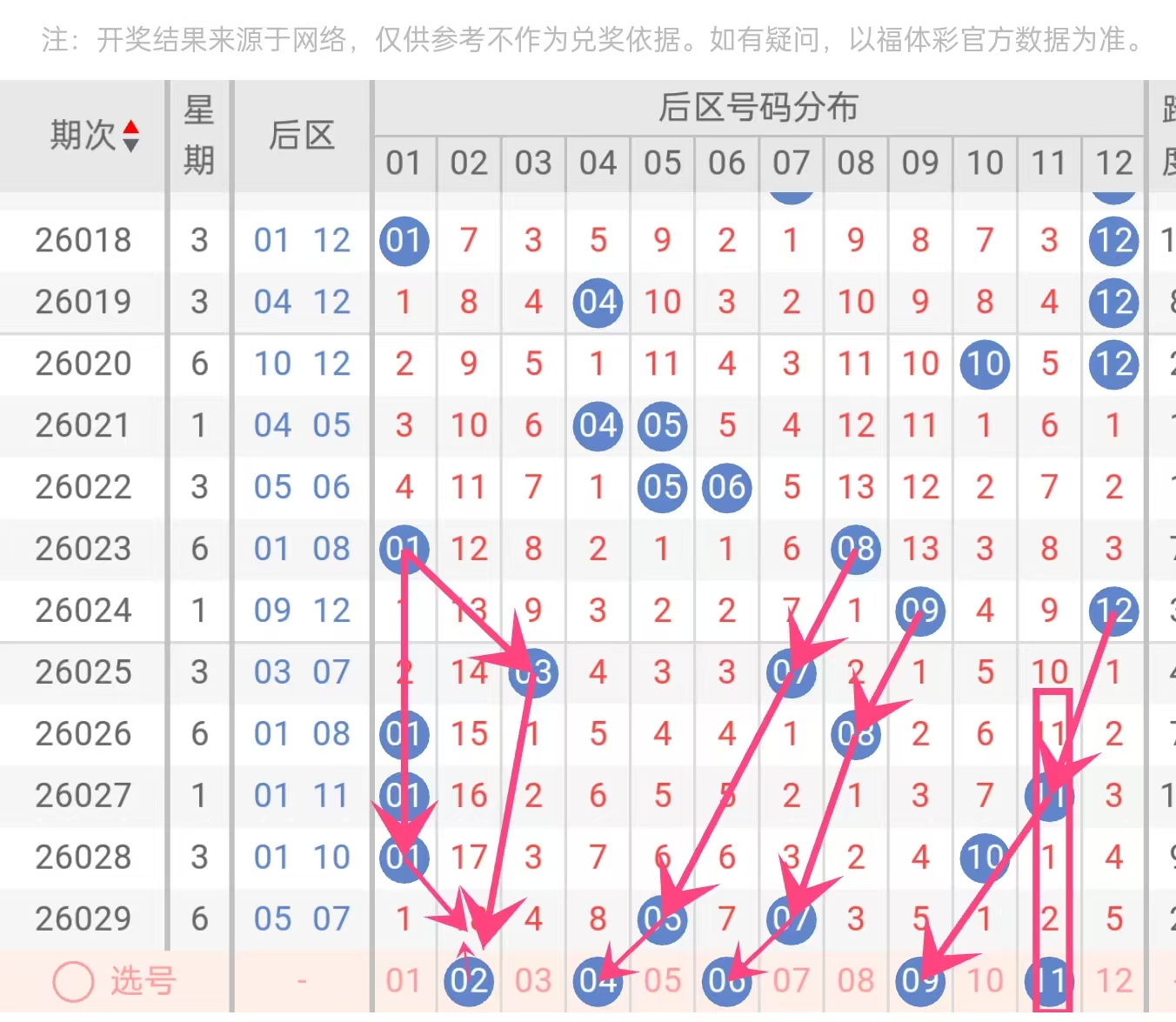 前区01、10、11在近5期内出现2次及以上,属短期热号,根据“热号不连热”原则,本期可杀;29在028、025期出现,与34同为近期三区热码,但三区近期过热,回调概率大,故一并杀之。后区01近4期出现3次,05、07近3期出现2次,热度过高,且后区奇号连开多期,本期看好奇偶转换,故杀上述三个奇数后区号。