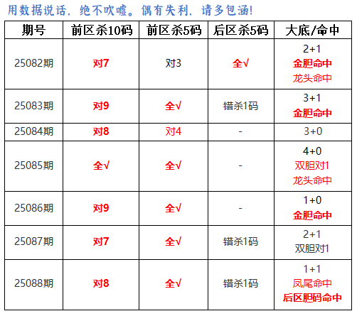上期前区杀10码对9,杀5码对4,三胆对1,大底命中2+0,本期再接再厉!