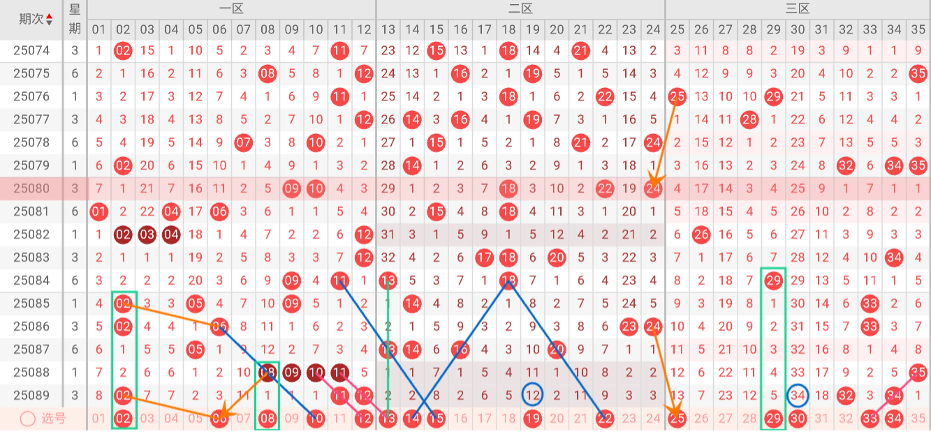三区(25-35)分析:上期该区开出号码32 34,近10期占比16%,与上期相比+2%。本期三斜连号趋势:33,无隔码斜连走势。断区后稳定1-2码,但中段27-31遗漏均值≥18期。近5期均值仅为1,上期增至2枚但仍低于理论值,冷号解冻需求显著,本期出号可能在2枚,但断区概率达70%,最好能多买一注防断区。推荐关注号码:25、29、30、33、34。