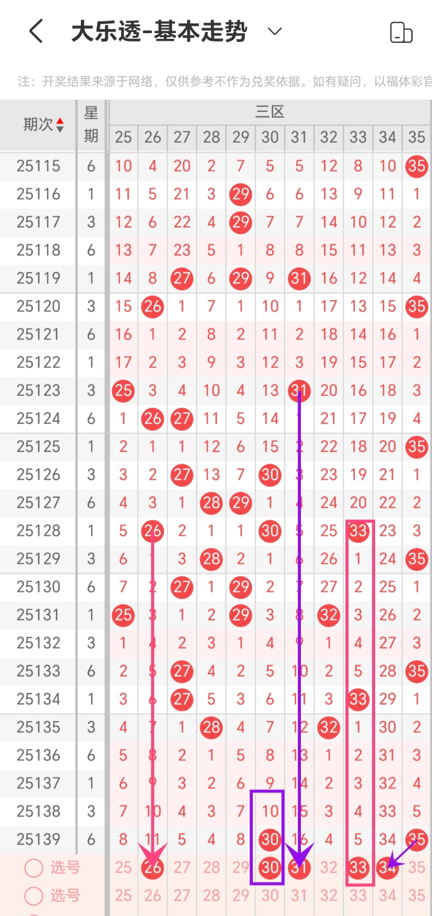 通过对同期次隔三期重号出现的数量规律进行统计分析,本期考虑出号0-2个,即05-24-26-33-35出号0-2
