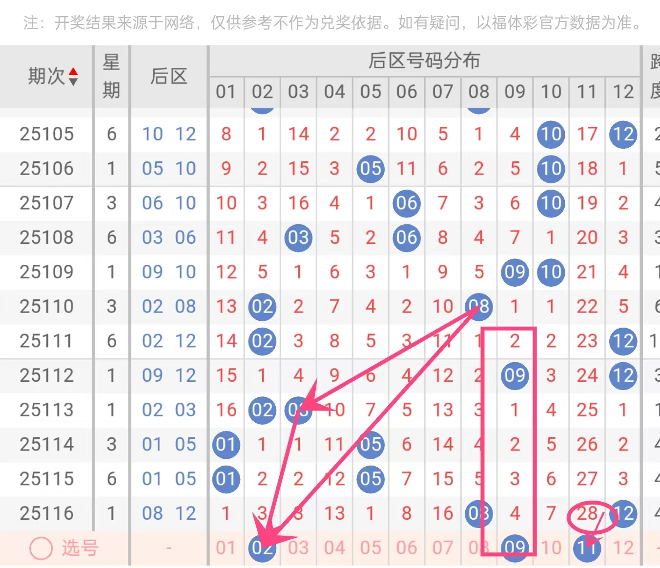 11:尾段号码,与02、09形成良好的跨度配合。覆盖后区不同数值区间,完善整体搭配。