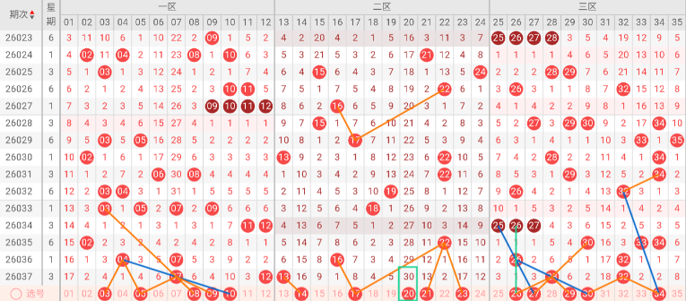 该区间在经历断区后,连续两期开出3码,最近两期回落至2码。这表明三区的热度虽然有所下降,但仍处于高位运行。在热度尚未消退的情况下,本期仍看好维持2码左右,但需防小幅回调至1码。推荐关注号码:26、27、29、30、34。