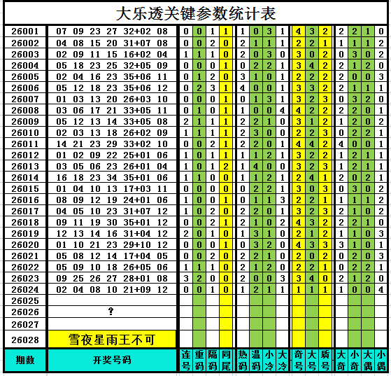 以下是作者手工统计的大乐透关键参数统计表,对喜欢参数分析、过滤缩水、选号胆杀的技术性大乐透爱好者有所帮助,其它读者可略过不看。