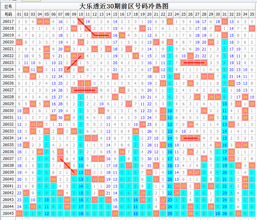 大乐透近30期前区号码冷热图(数字为遗漏期数,蓝色标记的为遗漏超过10期的大冷号)