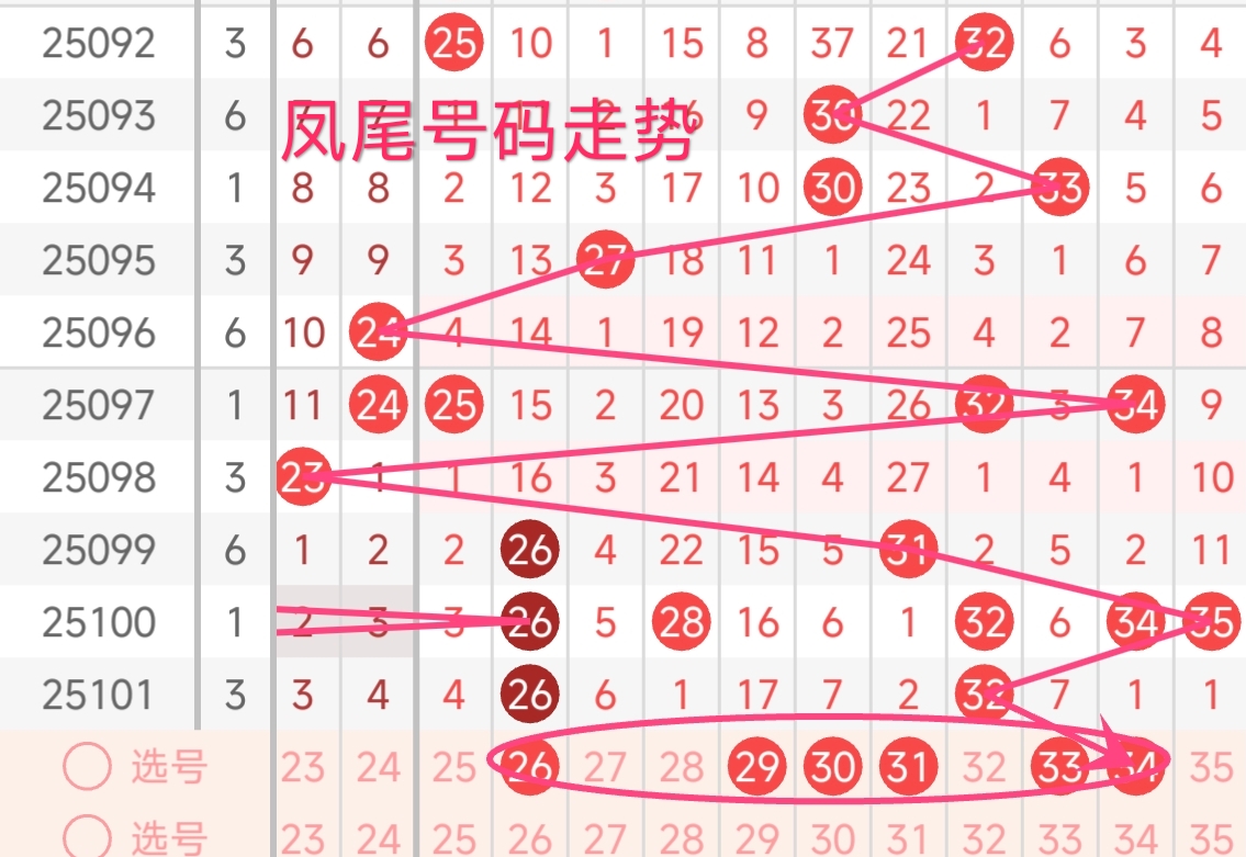 红球三区推荐(25~35):上期红三区开出2枚号码,号码为26、32,本期红三区建议出号1-2枚,本期红三区推荐关注号26、29、31、33、34。