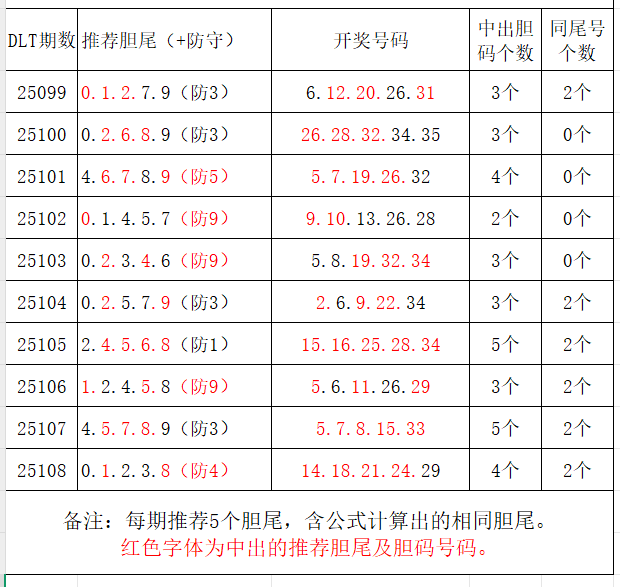 如图,每期推荐胆尾中出1-4个。上期推荐胆尾中出3尾4码!推荐胆尾是按照公式计算的顺序,不定位红球号码的顺序。本期推荐胆尾:2尾/4尾/5尾/3尾/0尾,加推防守胆尾+胆码号码:***(会员专区可见)。个人分析,仅供参考。