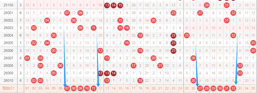 上图是体彩大乐透前区开奖号码走势分布图,我在上面走势图中用蓝色箭头标注出来的区域,分别是07 08 09 10 11 和27 28 29 30 31 32这两个区域最近出现的号码并不是很多,那么本期个人观点就是关注这些区域出号码。