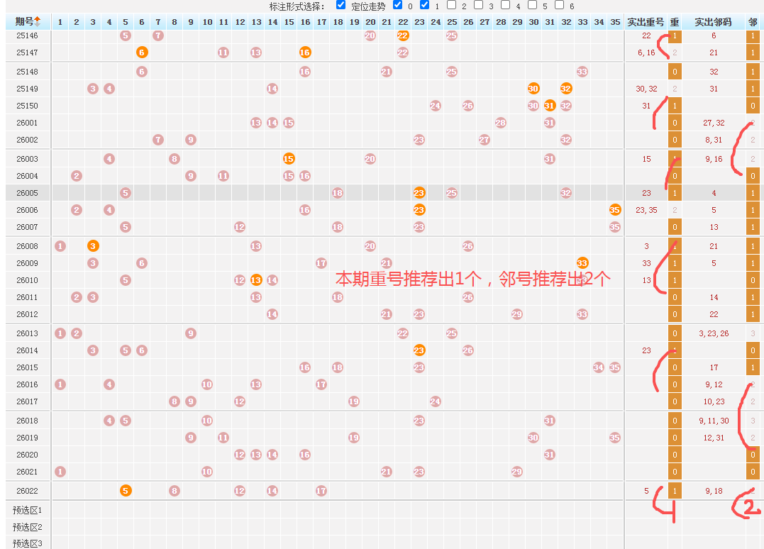 一、2026023期大乐透条件分析(重号、连号、邻号、奇偶比、三个区间比、大小比):
