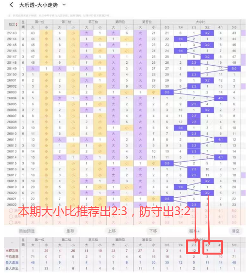 5、大小比:上期开出大小比为2:3,近117期开出4:2出现25次,3:2出现47次,2:3出现50次,1:4出现30次,5:0出现4次,本期推荐出2:3,防守出1:4。