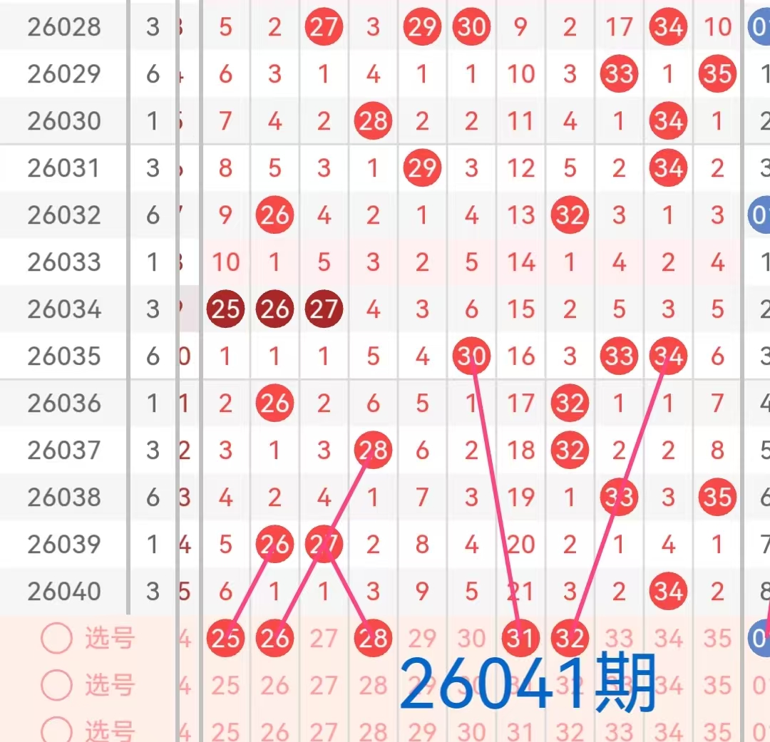 2. 凤尾号码分析:凤尾号码(前区最大号码)上期是34。这是一个大的凤尾,过去十期内,凤尾号码多集中在18到35之间,其中3字头号码表现较为活跃。因此,本期应重点关注18-35区间的数字,特别是号码25、28、31、32