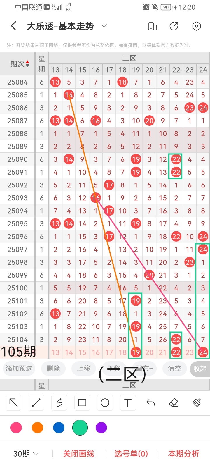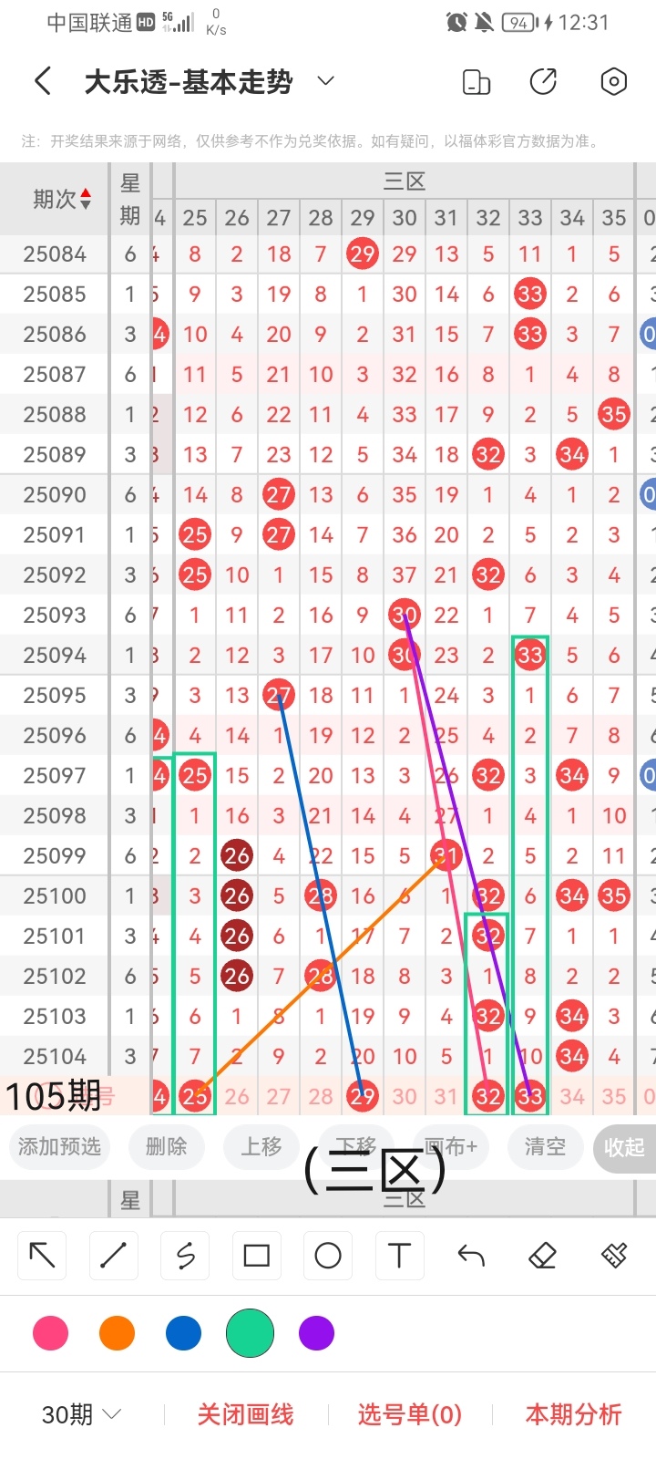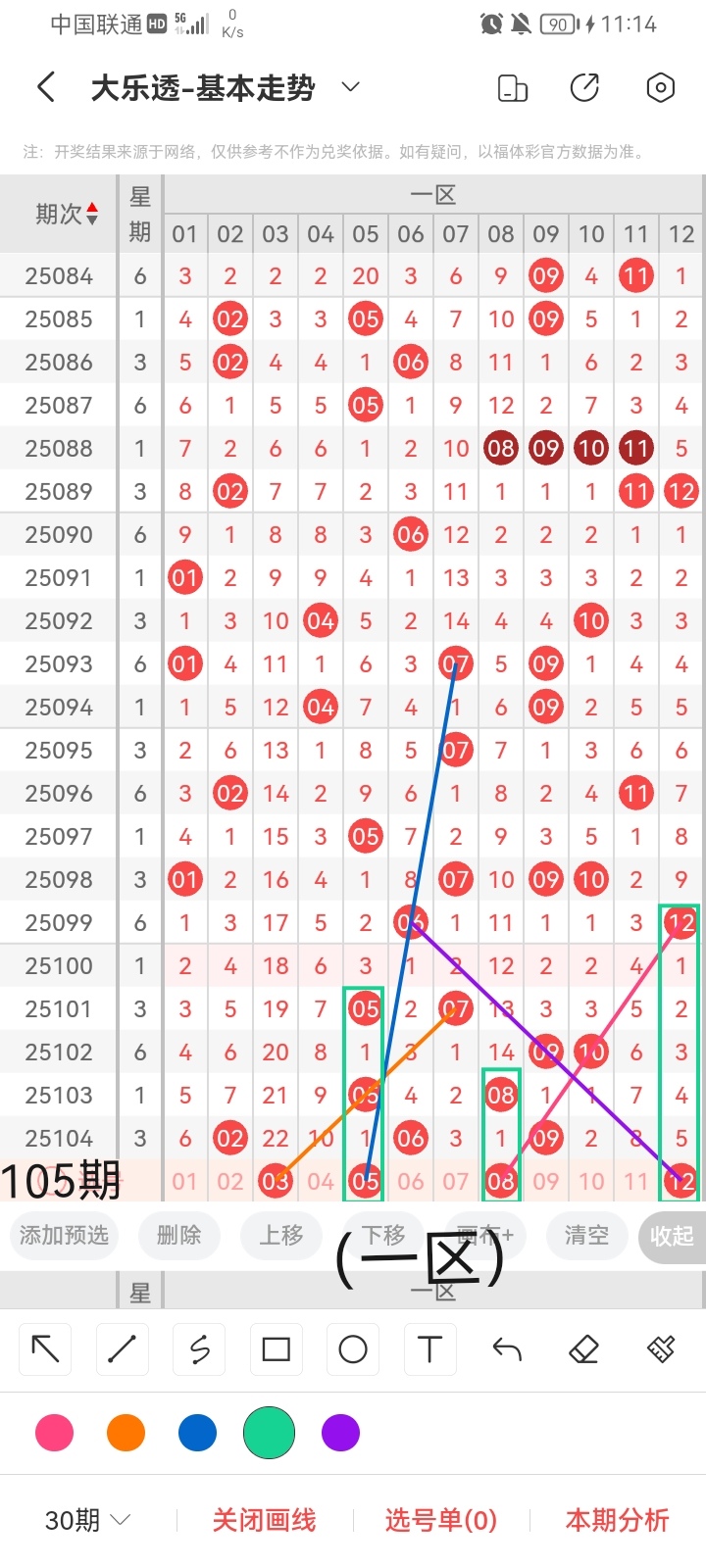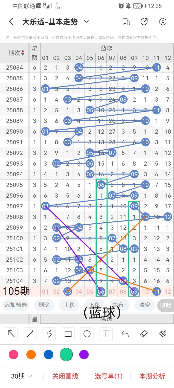 通过以上对上期的简单回顾,下面进入大乐透第2025105期(下面简称本期)的选号分析: