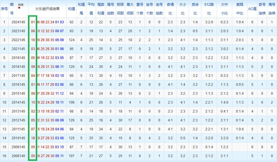 通过观察,我发现往年同期的开奖数据与本期号码之间存在显著关联。具体来说,在前区号码中,从第一位至第五位,通常会有约三个位置上的数字与往年同期相同位置的号码一致;而后区号码中,也有多期开奖结果直接包含了往年同期的数字。因此,我们可以借助往年同期各位置上的号码,作为分析本期开奖情况的重要依据。在此基础上,还可结合往年同期的其他相关条件,进行综合性的号码组合推荐。