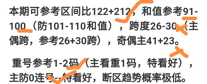 本期可参考区间比113+122,和值主看101-110(防91-100和值),跨度24+29(看奇跨),奇偶主23。