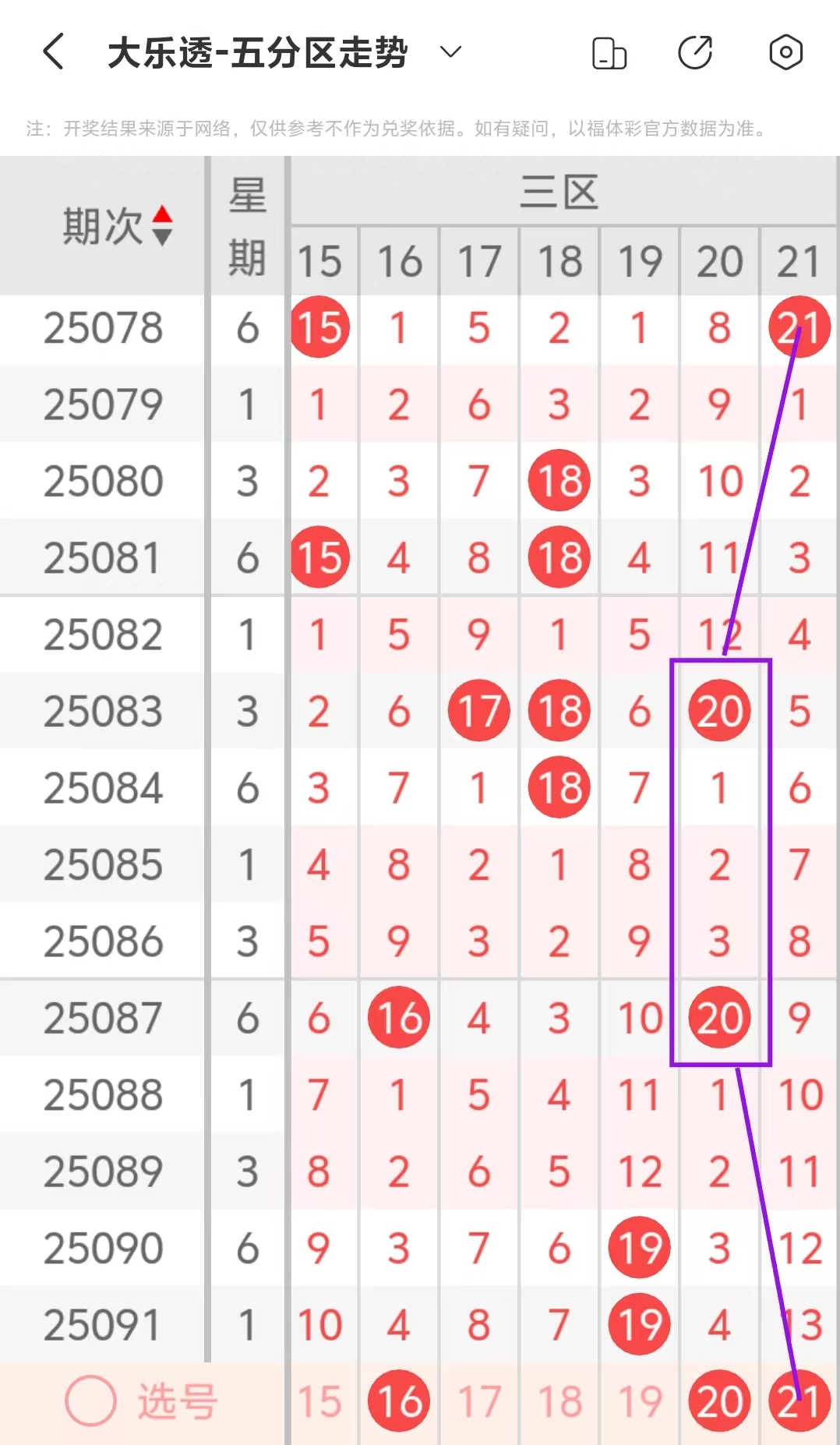 三区15-21号在34期中合计开出39个号码(理论值36个,少3个):