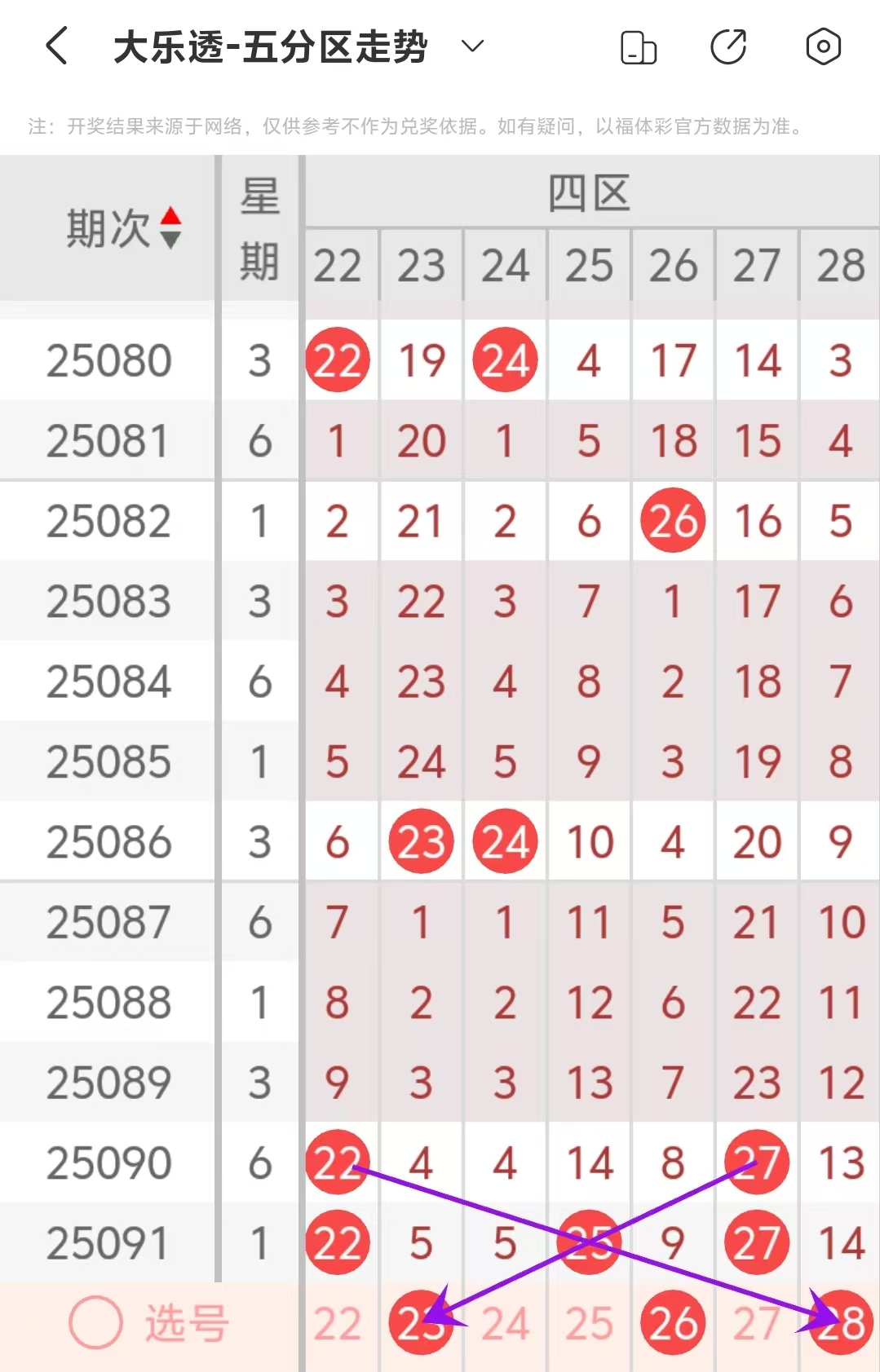 四区22-28号在34期中合计开出30个号码(理论值36个,少6个):