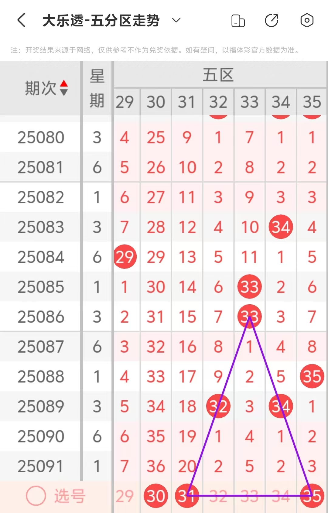 五区29-35号在34期中合计开出32个号码(理论值36个,少4个):