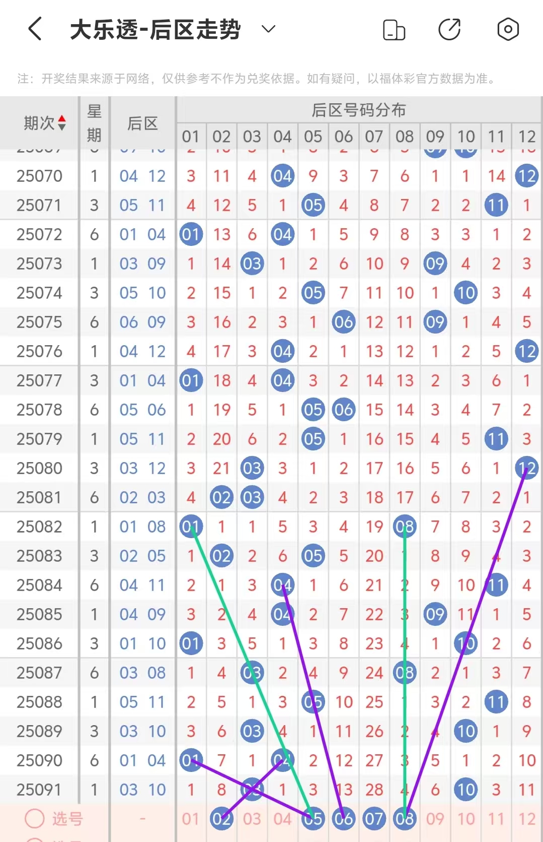 后区是从01-12号每期开出2个号码,在36期中,理论上每个号码应该出现6次,超出6次的号码是热号,低于5次的号码是冷号,出现5-6次的号码是温号。