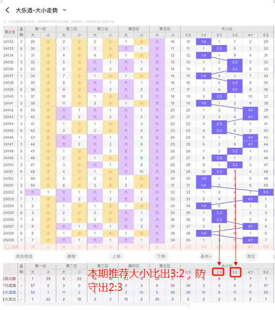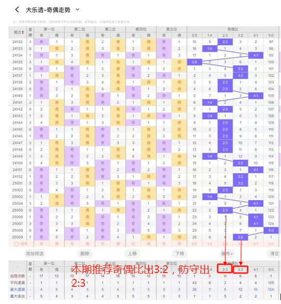6、 大小比:上期开出大小比为1:4,近10期开出4:1出现4次,3:2出现2次,2:3出现4次,1:4出现4次,5;0出现1次,本期防守出遗漏11期的3:2大小。本期重点推荐出3:2。