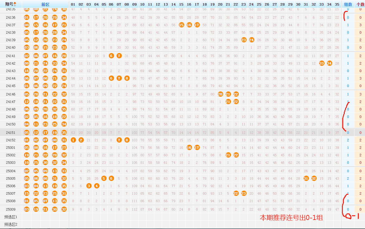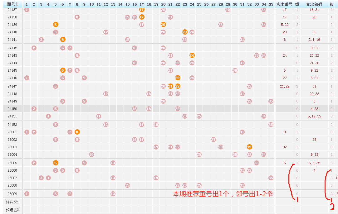 1、前区重号走势:上期前区未开出重复奖号,近10期出号个数为0-0-0-1-0-1-0-1-0-0-0-0,最近10期有2期有重号开出,近期重号个数下降,本期推荐重号继续走冷,防出0-1个重号。