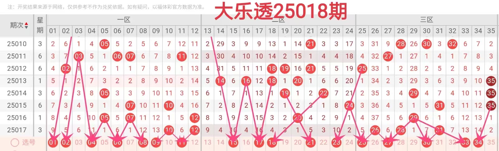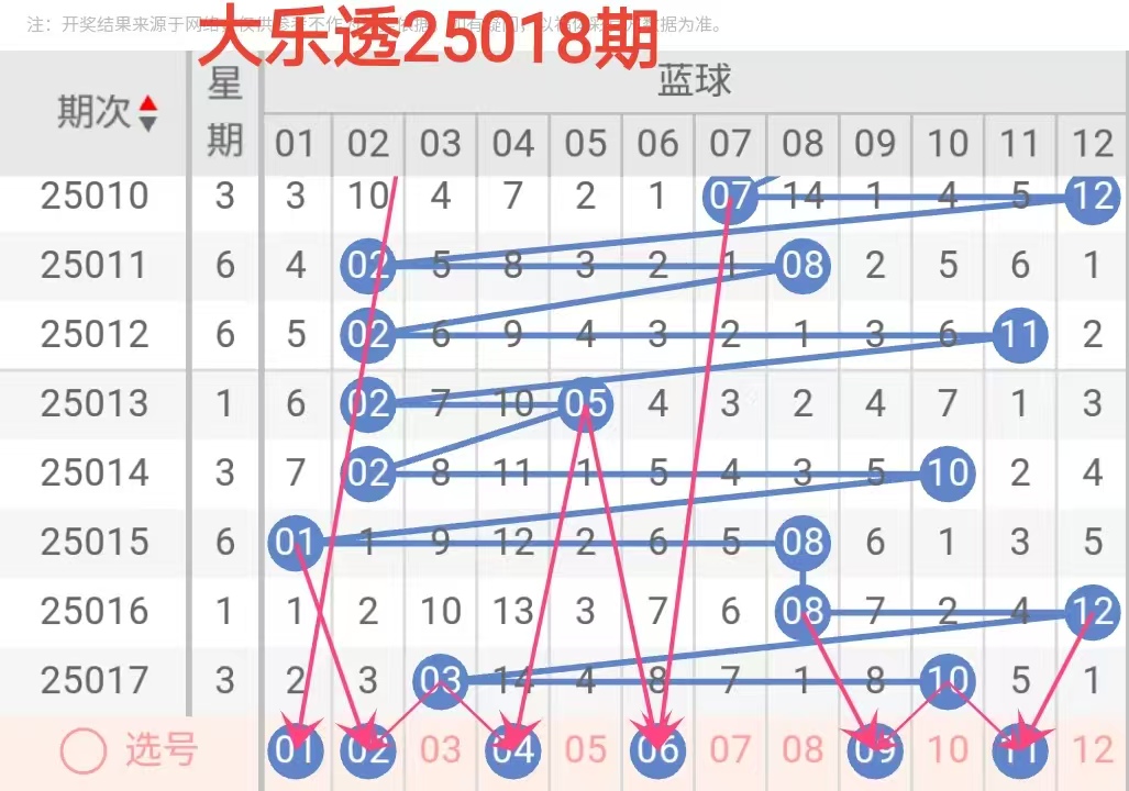 三、25018期大乐透箭头走势图--红+蓝(文章数据整理由彩虹号任先生分析提供)