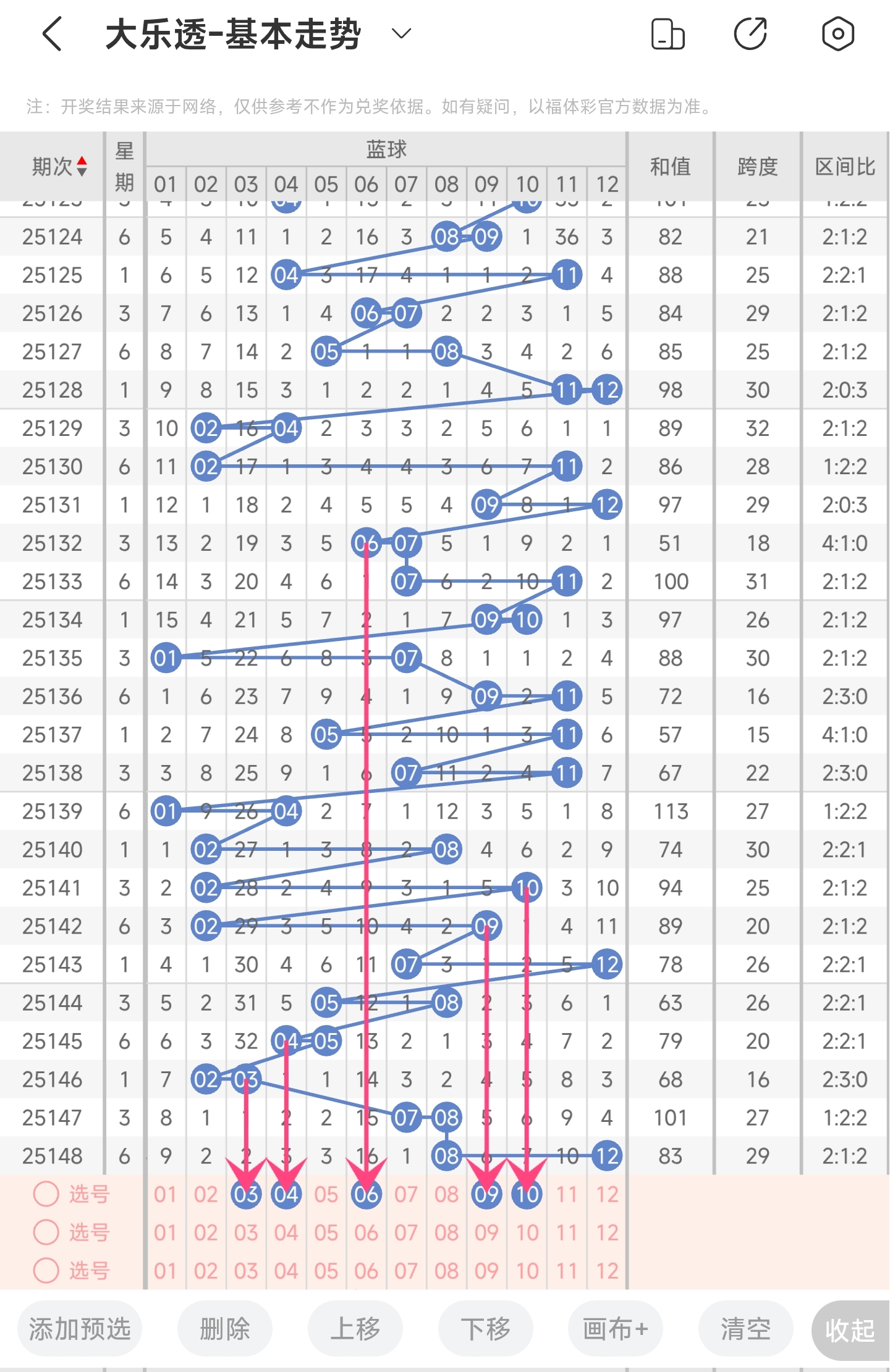 上期开出了812号球。往前一期开出了78号球。通过分析蓝区走势图,我们可以看到蓝球最近的开号走势是从左往右的,推测本期有可能从右往左,比较看好右边和中间的号码。跨度的话应该不会特别大。最后再结合冷热号情况以及遗漏期数,本期我们可以关注346910等号。综上所述本期我们推测可能开出346910等号码。