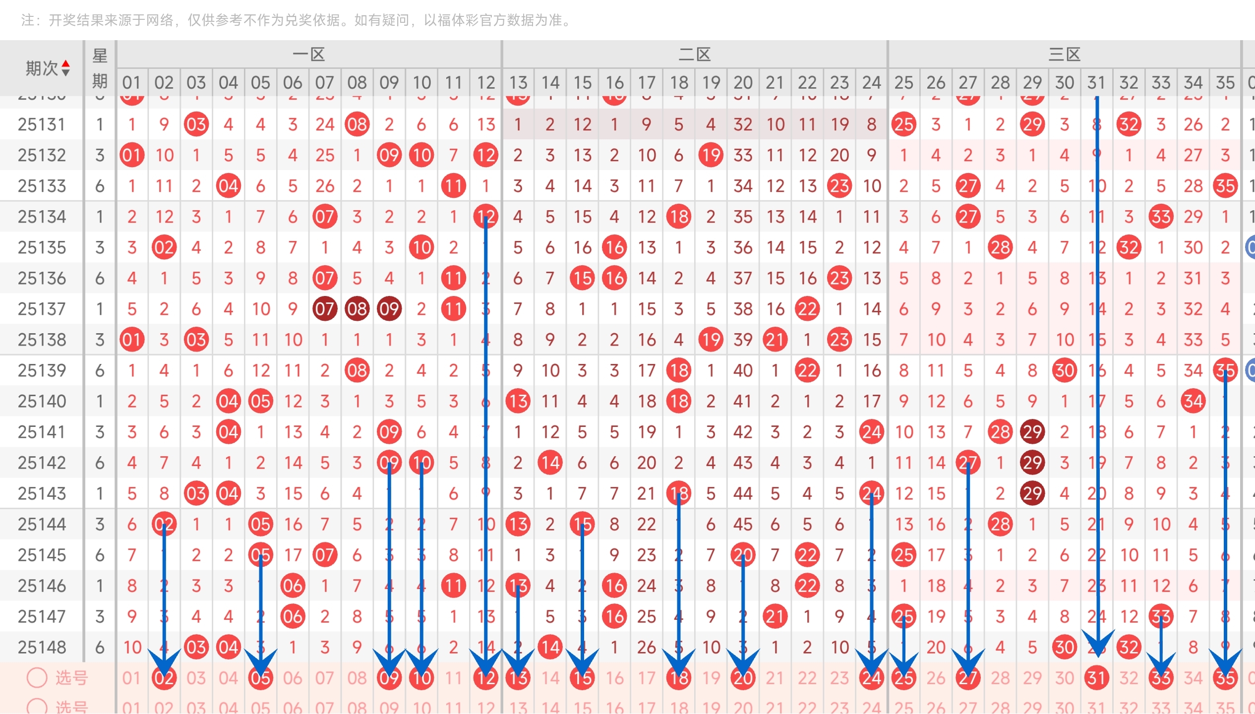 上期开出了3032号码,往前一期开出了2533号球。通过分析走势图,可以看到最近2期凤尾都回补了右边的号码,推测本期有可能继续回补,其次还比较看好的是左边的号码。最后再结合冷热号和遗漏期数,本期我们可以关注2527313335等号。综上所述本期三区我们推测可能会开2527313335等号码。