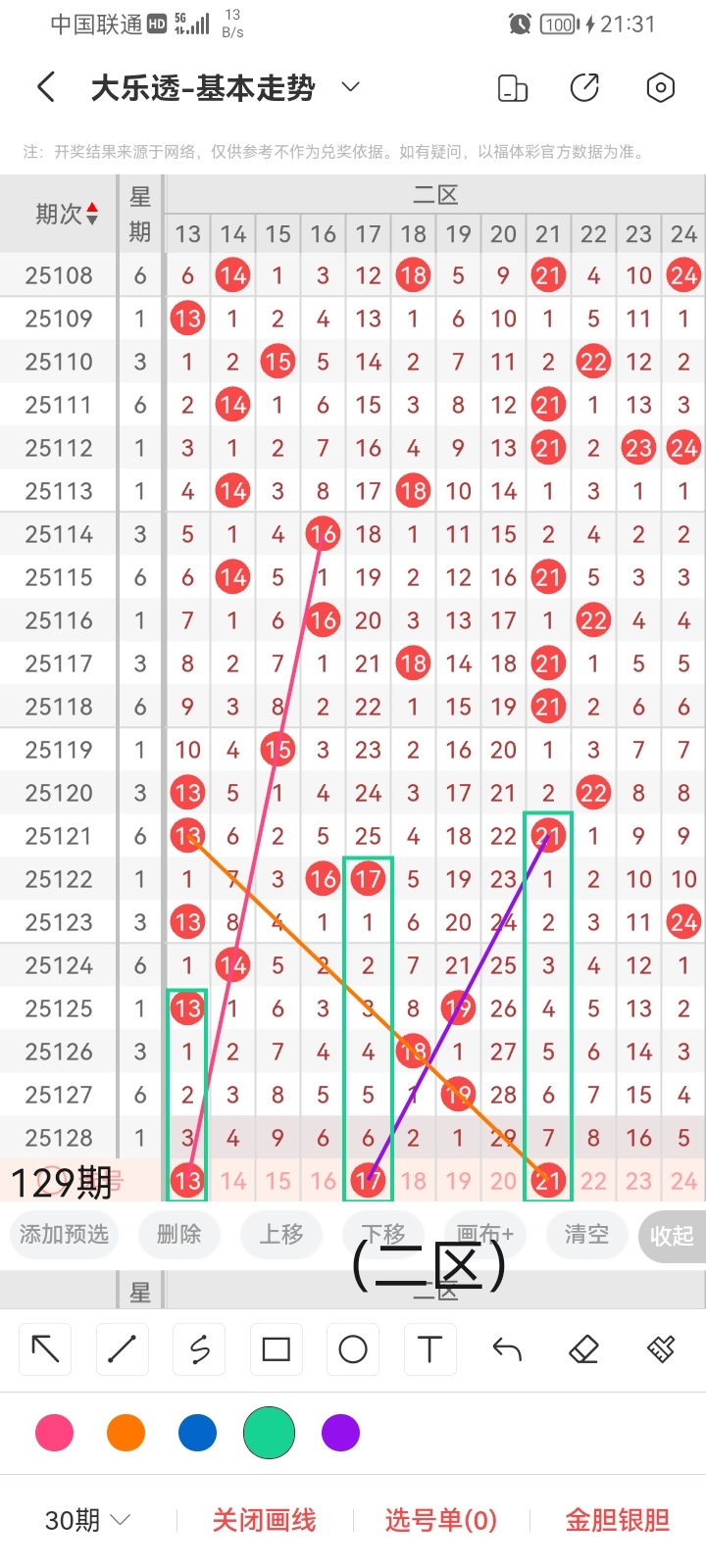 小梁结合最近五期第二区开出号码比例1:2:1:1:0,取五期的平均值,本期第二区间开出的号码个数约为1个。首先,我们根据图中画线的思路可以看出,号码13与前几期开出的号码呈隔三期回补的走位且呈斜四连的走势;号码17与前几期开出的号码呈斜三连的走势且呈隔六期回补的走位;需关注小梁。然后,号码21与前几期开出的号码呈隔七期回补的走位且呈斜四连的走势。综上所述,小梁根据图中思路,推荐本期第二区的号码:13、17、21。