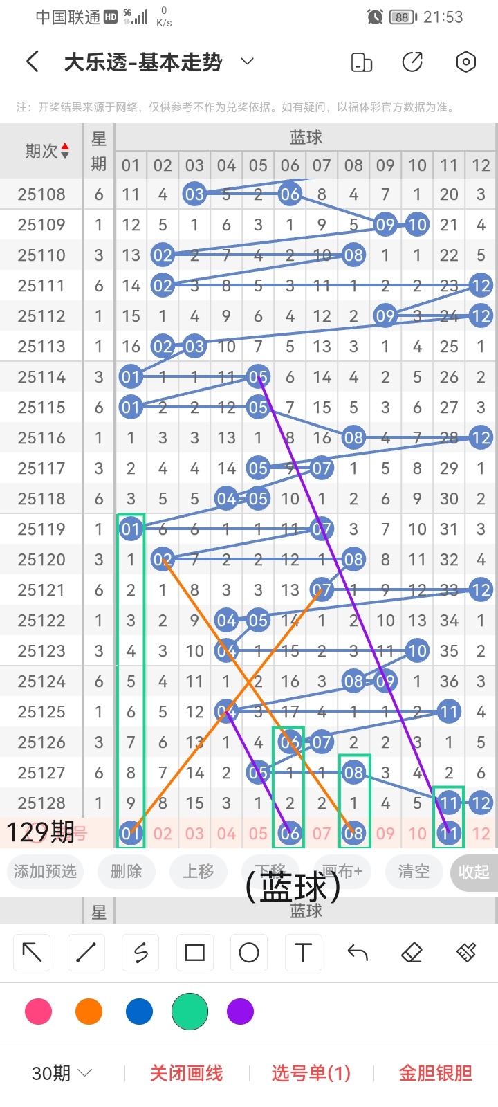 小梁根据图中画线思路,最后给大家汇总提供一下大乐透本期红球、蓝球数据,供大家参考: