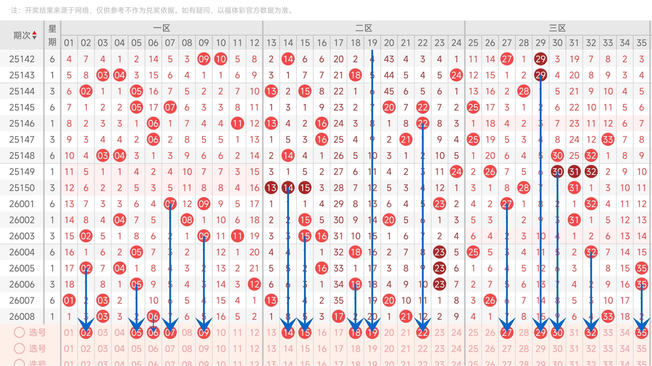 上期开出33号码,往前一期开出了26号。通过分析走势图,可以看到上期凤尾开了33,又开回了右边的号码,从近期凤尾走势看,基本开在左右两边,本期主要关注左右两边的号码,防中间的号码回补。最后再结合冷热号和遗漏期数,本期我们可以关注27,29,30,32,35等号。综上所述本期三区我们推测可能会开27,29,30,32,35等号码。