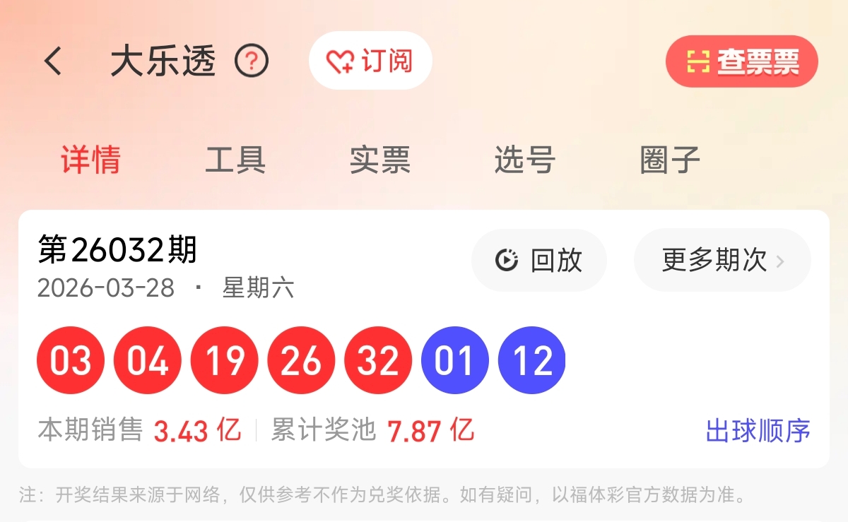 首先让我们回顾一下上期大乐透26032期的开奖为03、04、19、26、32,蓝球01、12。前区和值84,前区跨29,区间比为2:1:2,奇偶比为2:3。