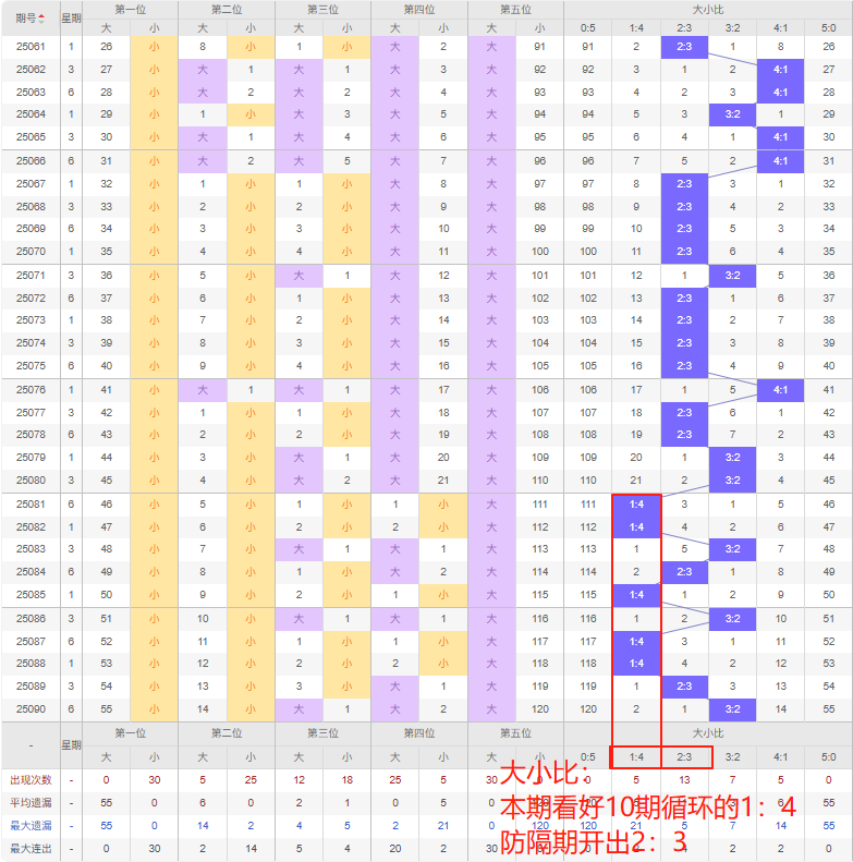 上期大小比:3:2,近10期大小比出现情况:1:4、1:4、3:2、2:3、1:4、3:2、1:4、1:4、2:3、3:2,最近10期出现3期3:2,出现2期2:3,出现0期4:1,出现5期1:4,出现0期5:0,出现0期0:5,根据近10期规律本期看好10期循环的1:4,防隔期开出2:3,综上所述推荐大小比推荐:2:3,重点关注:1:4。