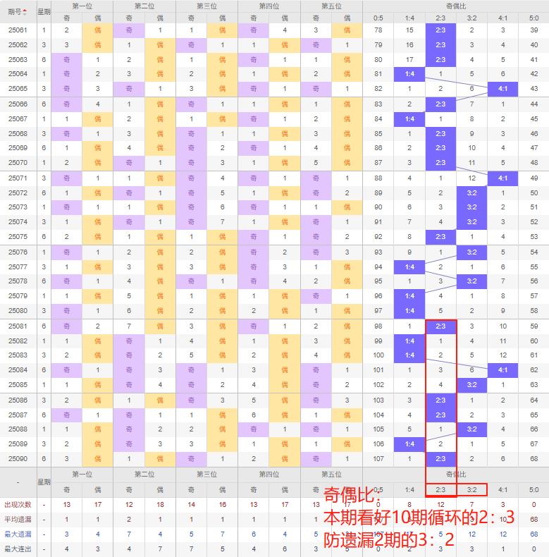 上期奇偶比:2:3,近10期奇偶比出现情况:2:3、1:4、1:4、4:1、3:2、2:3、2:3、3:2、1:4、2:3,最近10期出现2期3:2,出现4期2:3,出现1期4:1,出现3期1:4,出现0期5:0,出现0期0:5,根据近10期规律本期看好10期循环的2:3,防遗漏2期的3:2,综上所述推荐奇偶比推荐:3:2,重点关注:2:3。