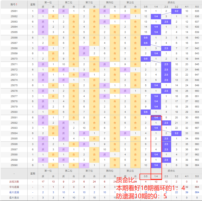 上期质合比:1:4,近10期质合比出现情况:1:4、2:3、1:4、3:2、2:3、2:3、2:3、1:4、2:3、1:4,最近10期出现1期3:2,出现5期2:3,出现0期4:1,出现4期1:4,出现0期5:0,出现0期0:5,根据近10期规律本期看好10期循环的1:4,防遗漏10期的0:5,综上所述推荐质合比推荐:0:5,重点关注:1:4。
