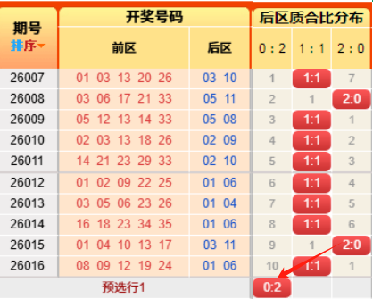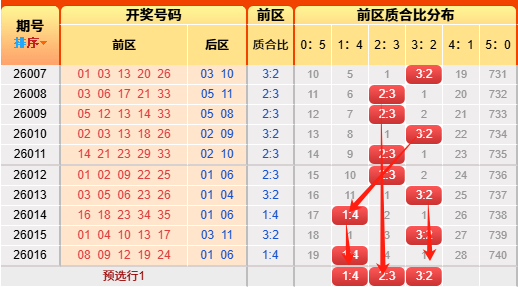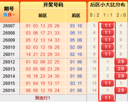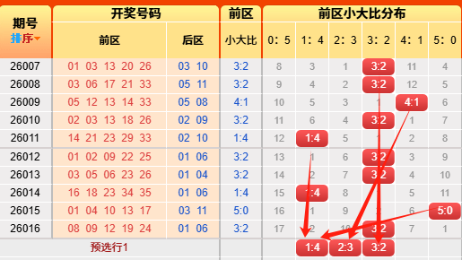 上期前区小大比3:2。言归正传我们继续用历史数据说话,前区小大比分成6种0:5、1:4、2:3、3:2、4:1、5:0(如图),我统计了一下历史出现次数,0:5出现107次、1:4出现517次、2:3出现979次、3:2出现820次、4:1出现356次,5:0出现55次,再看近10期小大比出现次数比为0:2:0:6:1:1,通过历史数据对比观察以及根据遗漏对称理论原则,故本期我们选择2:3、3:2、1:4;(具体精准方向请查看小车小大比精选)