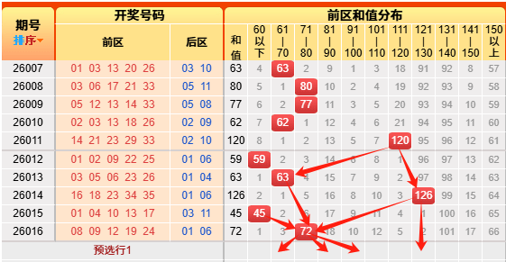 上期开出和值72。本次我们先根据历史次数统计,和值60以下开出252次、61-70开出240次、71-80开出376次,81-90开出488次、91-100开出499次,101-110开出383次、111-120开出314次、121-130开出156次、131-140开出90次、141-150开出27次、150以上开出9次,再来看近十次以上和值分别开出了2次、3次、3次、0次、0次、0次、1次、1次、0次、0次、0次 ,低于阈值的有60区间以下、61-70区间、81-90区间、91-100区间、101-110区间、121-130区间,再根据遗漏斜率对称理论,本期注意81-90区间、61-70区间、121-130区间、91-100区间。