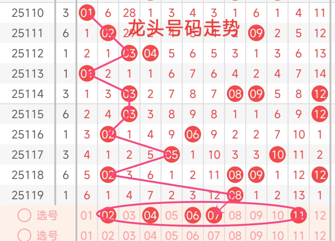 上期龙头号码为08,振幅上升了6点,开出偶数号码。从近期龙头号码的走势来看,近期老头号码波动较小。上期龙头是 02,属于小数偶数号码。回顾近期龙头号码,近期龙头号码在01 - 08之间变动,呈现出小范围波动的态势。预计本期龙头号码可能继续在小号区产生。预计本期龙头可以关注红一区01-12区间开出。本期还需注意连续多期漏出的号码,需重点关注,有回补龙头号码的趋势。 综合考虑,本期龙头号码推荐关注:02、04、06、07、11。