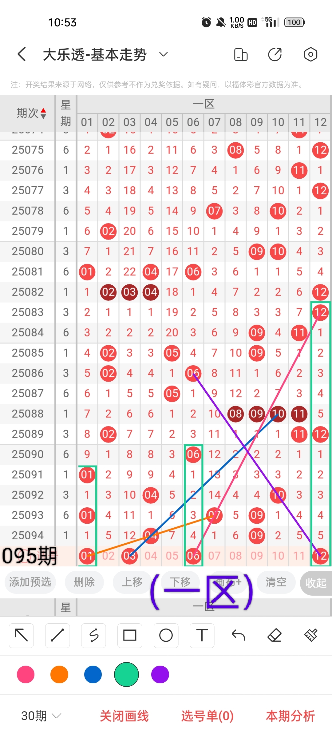 通过以上对上期的简单回顾,下面进入大乐透第2025095期(下面简称本期)的选号分析: